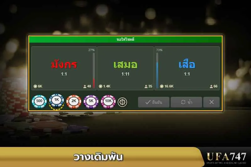 ขั้นตอนที่ 5: วางเดิมพัน เริ่มต้นวางเดิมพันขั้นต่ำเพียง 10 บาท ตรวจสอบจำนวนเงินและข้อมูลการวางเดิมพันให้ถูกต้อง ก่อนกดปุ่ม “วางเดิมพัน” เพื่อยืนยันการเล่น